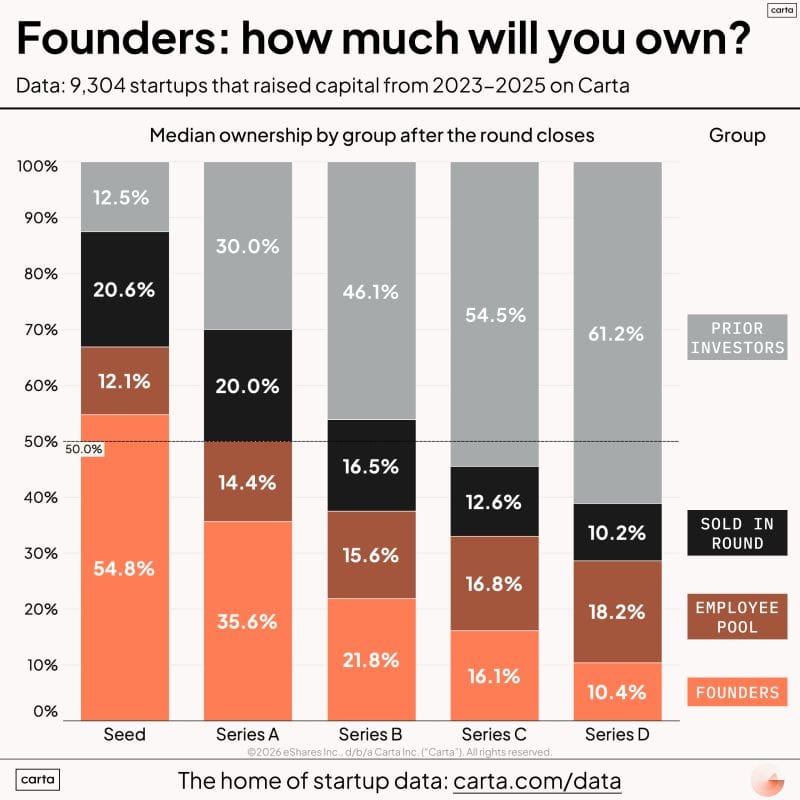 I’ve always wondered what the cap tables look like at an average startup, and this chart from Carta gives a great insight. Raising millions sounds impressive, but it really can be dilutive.